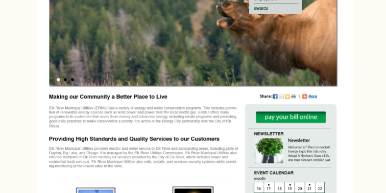 Web Site Design – Our agency designed, programmed and produced a custom web site that presents Elk River Municipal Utilities as a unique provider of electric and water utilities service that helps communicate and educate customers in the use of utility services, programs,and policies. The website is responsive, visual and allows their customers to utilize their site to keep informed on future plans of the cities services. Our creative team produced various concepts and layouts before programming the final site. The site also includes an easy to use product section that allows for the selection and information on their various services and programs. A simple and responsive content management system was implemented and allows for easy updates to the site as well as hosting, SEO and analytics.